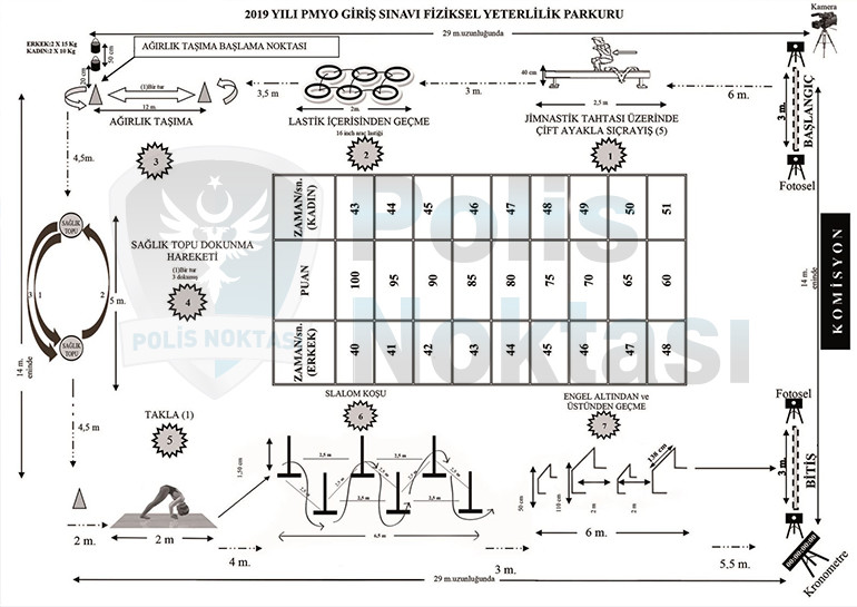 Polis Meslek Yüksekokulu aday değerlendirme ve seçme işlemlerinin bir aşaması olan fiziksel yeterlilik aşamasında polislik mesleğini icra edecek adayların denge, kondisyon, çeviklik, çabukluk ve esneklik açısından polislik mesleğine uygunluklarını ölçecek parkur, yukarıda belirtilen ebat ve etaplardan oluşturulmuştur. PMYO fiziksel yeterlilik parkuru ve zaman/puan cetveli oluşturulmuş ve ekte sunulan şablonda belirtilmiştir.