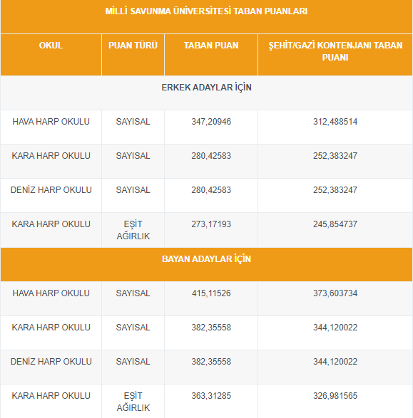 2023 – Kara Harp Okulu taban puanları yıldan yıla değişiklik göstermektedir. Okula alımlarda kadın ve erkek adaylar farklı puanda değerlendirilir. Okula en son giriş yapan düşük puanlı erkek öğrenci bir dahaki sene için taban puanı belirlemiş olur. Aynı durum kadın adaylar için de geçerlidir ve erkekler ile kadınlar farklı taban puanlarında değerlendirilir. Bu yüzden kadın adaylar başvuru yaparken sadece kadınların taban puanlarını inceleyebilir, erkekler ise yine sadece kendi bölümlerindeki erkek öğrencilerin taban puanlarını inceleyebilmektedir. Alt kısımdan güncel olarak hem kadın hem de erkek adaylar için Kara Harp Okulu dahil olmak üzere diğer harp okullarının taban puanlarını inceleyebilirsiniz.