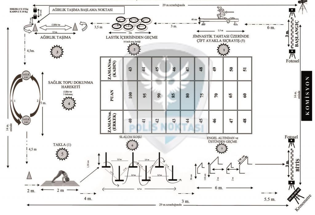 - Sağlık topuna dokunma hareketinde aday önce en uzaktaki topa dokunarak sonra geçerken dokunmadığı ilk topa dokunacak ve sonra ilk dokunduğu topa tekrar dokunarak istasyonu tamamlayacaktır. Bu istasyonu bu şekilde yapmayan, önce birinci topa dokunan sonra ikinci topa dokunarak diğer istasyona geçen adayın ikinci topa dokunması bir dokunuş sayılacaktır. İlk topa dokunması sayılmayacak ve bu şekilde iki top arasındaki mesafeyi kat etmeyecek şekilde diğer istasyona geçen adayın bitirme süresine ceza karşılığı olarak 6 (altı) saniye ilave edilecektir.