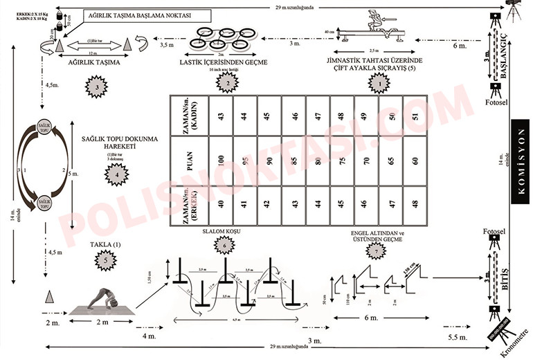• Sağlık topuna dokunma hareketinde aday önce en uzaktaki topa dokunarak sonra geçerken dokunmadığı ilk topa dokunacak ve sonra ilk dokunduğu topa tekrar dokunarak istasyonu tamamlayacaktır. Bu istasyonu bu şekilde yapmayan, önce birinci topa dokunan sonra ikinci topa dokunarak diğer istasyona geçen adayın ikinci topa dokunması bir dokunuş sayılacaktır. İlk topa dokunması sayılmayacak ve bu şekilde iki top arasındaki mesafeyi kat etmeyecek şekilde diğer istasyona geçen adayın bitirme süresine ceza karşılığı olarak 6 (altı) saniye ilave edilecektir.