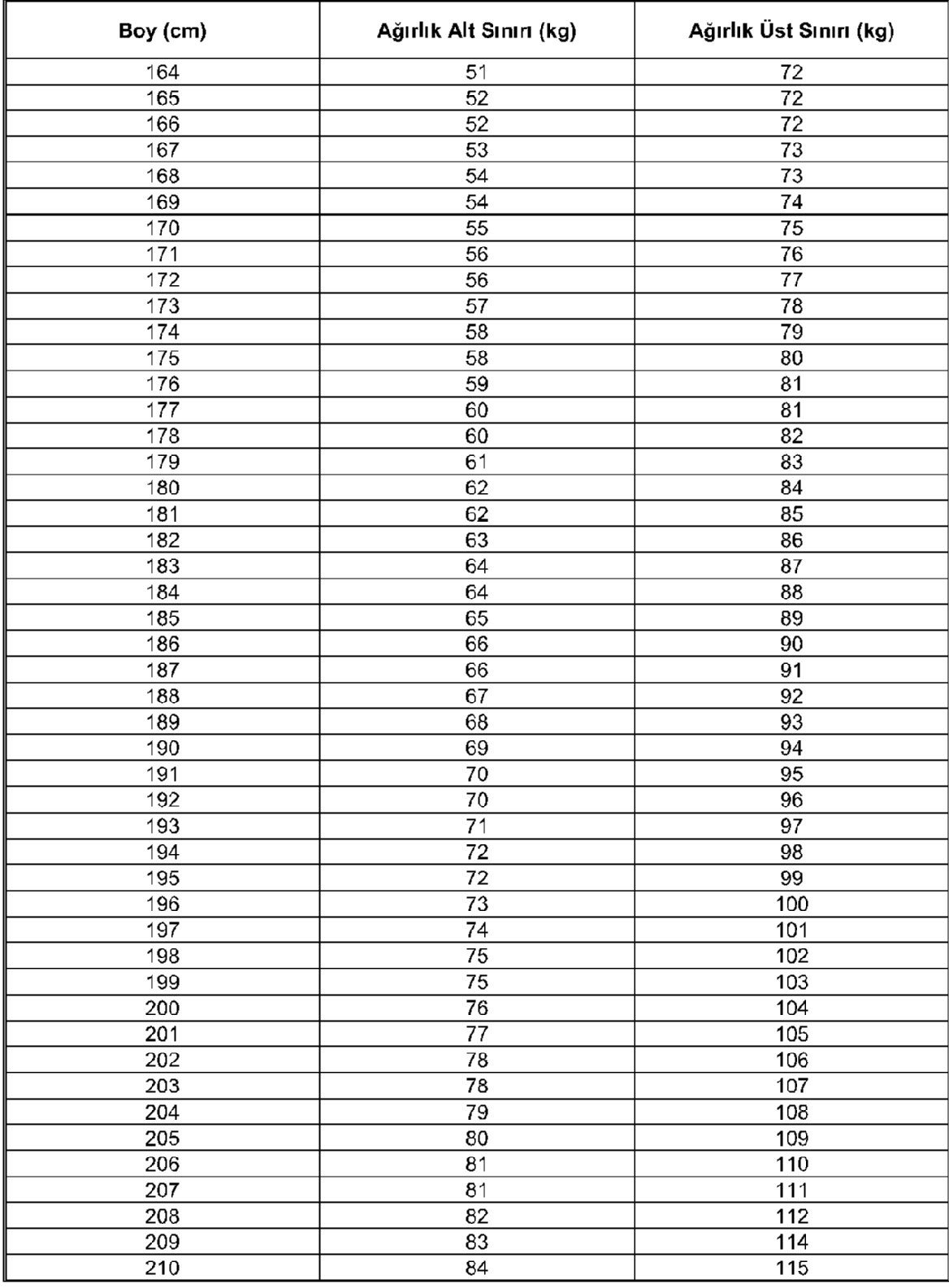 • Boy ve kilo oranları tablosunda belirtilen değerler içerisinde bulunmak,