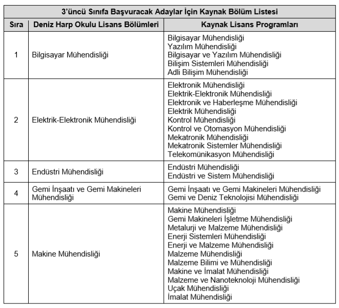 • 1. Üniversitelerin kılavuzda belirtilen lisans programlarından, Deniz Harp Okulunun 3. sınıfına (hâlihazırda üçüncü ve dördüncü sınıfta okuyan öğrencilerden) 2018-2019 eğitim öğretim yılı 2. yarıyılından başlamak üzere öğrenim görmek için erkek öğrenci alınacaktır.