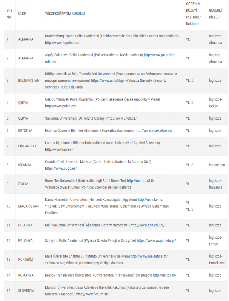 “Söz konusu programdan faydalanmak isteyen öğrenciler, yayımlanan başvuru formunu doldurup çıktısını aldıktan sonra imzalayarak yabancı dil puan belgesi ve not ortalamalarını belirtir 4’lük sistemdeki transkript ile birlikte Dışilişkiler ve Uluslararası Eğitim Şube Müdürlüğü’ne müracaat edeceklerdir. Yüksek lisans ve doktora düzeyinde ilk dönem başvuran ve henüz Polis Akademisi’nde transkripti oluşmamış öğrenciler, bir önceki yükseköğretim kademesinde alınan mezuniyet notunu gösterir transkript ile başvuru yapacaklardır.”
