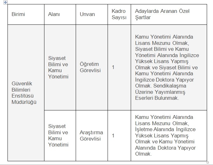 Güvenlik Bilimleri Enstitüsü Müdürlüğünde İhtiyaç Duyulan Öğretim Elemanı Alan, Unvan, Kadro Sayıları ve Başvuracakları Bilim Dalları ile ilgili olarak Aranan Özel Şartları Gösterir Tablo