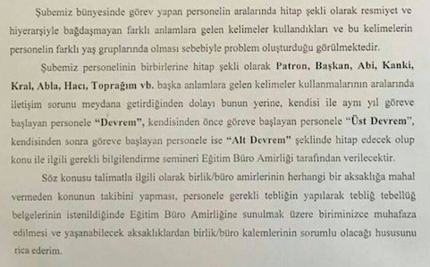 Şubemiz personelinin birbirlerine hitap şekli olarak Patron, Başkan, Abi, Kanki, Kral, Abla, Hacı, Toprağım vb. başka anlamlara gelen kelimeler kullanmalarının aralarında iletişim sorunu meydana getirdiğinden dolayı bunun yerine, kendisi ile aynı yıl göreve başlayan personele “Devrem“, kendisinden önce göreve başlayan personele “Üst Devrem“, kendisinden sonra göreve başlayan personele ise “Alt Devrem” şeklinde hitap edecek olup konu ile ilgili gerekli bilgilendirme semineri Eğitim Büro Amirliği tarafından verilecektir….”