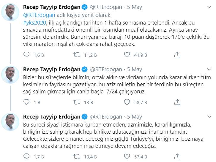 Sizlere Cumhurbaşkanı Recep Tayyip Erdoğan tarafından paylaşılan tweeti aktaralım. Görüldüğü üzere YKS tarihinin ertelenmeden önceki tarihten 1 hafta sonraya alındığını görmekteyiz.