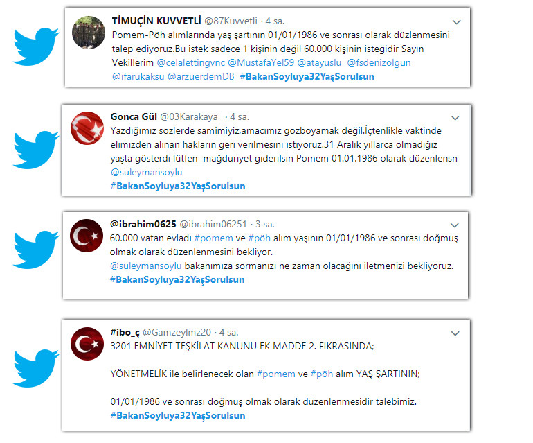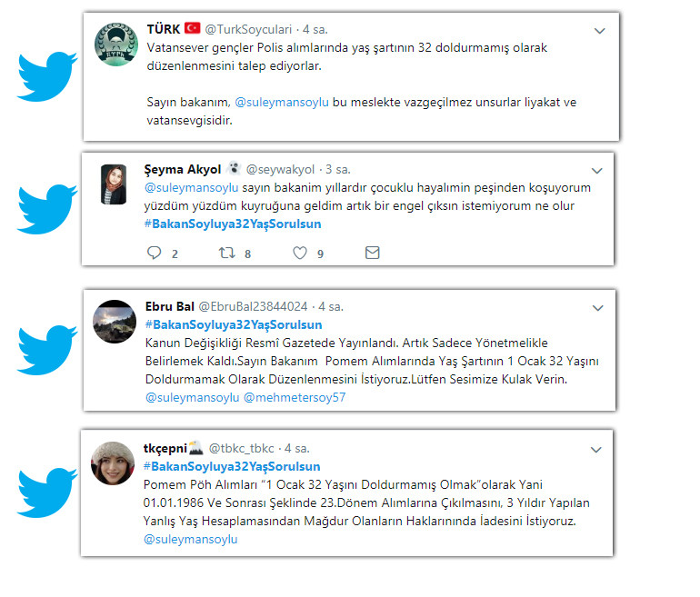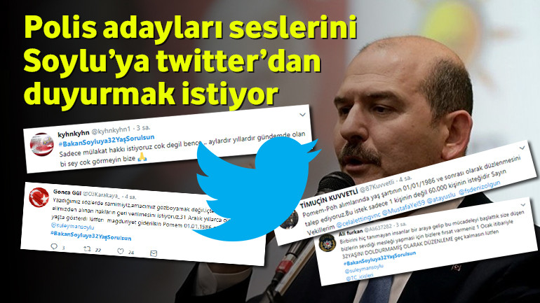 POMEM ve PÖH alım yaş sınırının 30 olması sebebiyle mağdur olan polis adayları İç işleri bakanı Süleyman SOYLU’ya twitter üzerinden seslerini duyurmaya çalışıyor. Yaş sınırının 32’ye yükselmesini isteyen adaylar Twitter’da trendler arasında. Atılan bazı twitleri listeledik PolisNoktası olarak konunun takipçisi olduğumuzu mağduriyet yaşayanlar açısından seslerini daha fazla kitlelere duyurması için konuyu haberleştirdik.