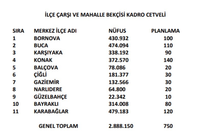 İzmir iline toplam 750 mahalle bekçisi alınacaktır. Başvurular 14-26 Kasım, sözlü sınav 7-15 Aralık, yazılı sınav ise 24 Aralık tarihinde yapılacak.