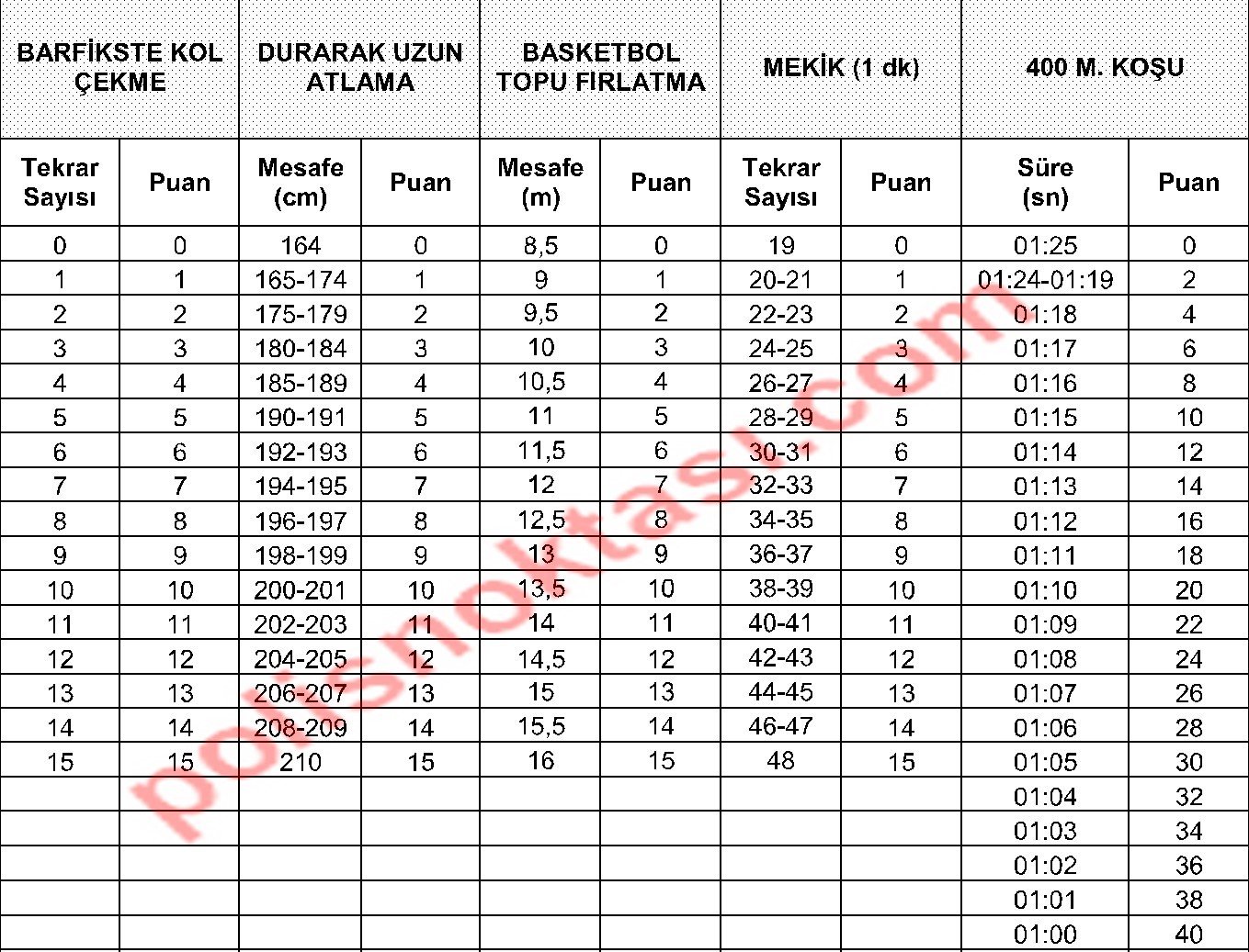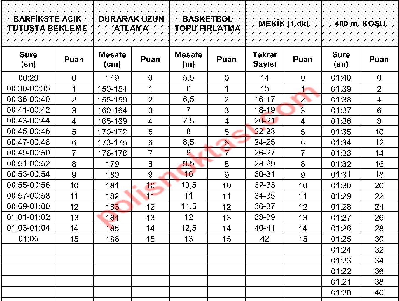 Erkek Adaylar İçin Fiziki Yeterlilik Parkuru ve Puanlama Tablosu